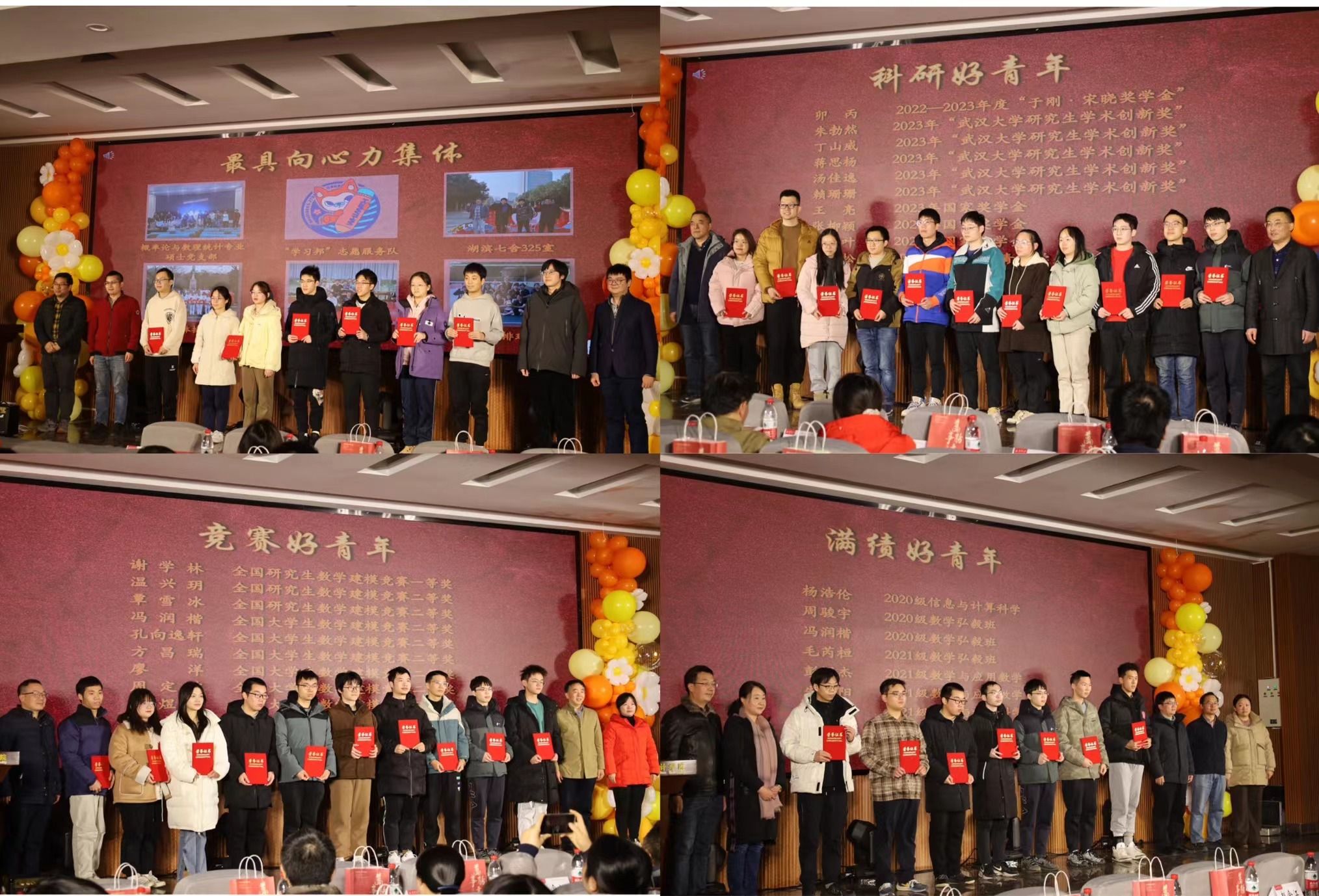 表彰环节,院领导和班级导师分别为“数统好青年”之科研好青年、竞赛好青年、满绩好青年、最具向心力集体颁奖。表彰2023年在学术科研、学科竞赛、课程学习、志愿服务、党团建设等领域取得突出成绩的学生和团队。这些成绩的取得彰显了数院学子敢于创新、勇于拼搏的精神风貌。