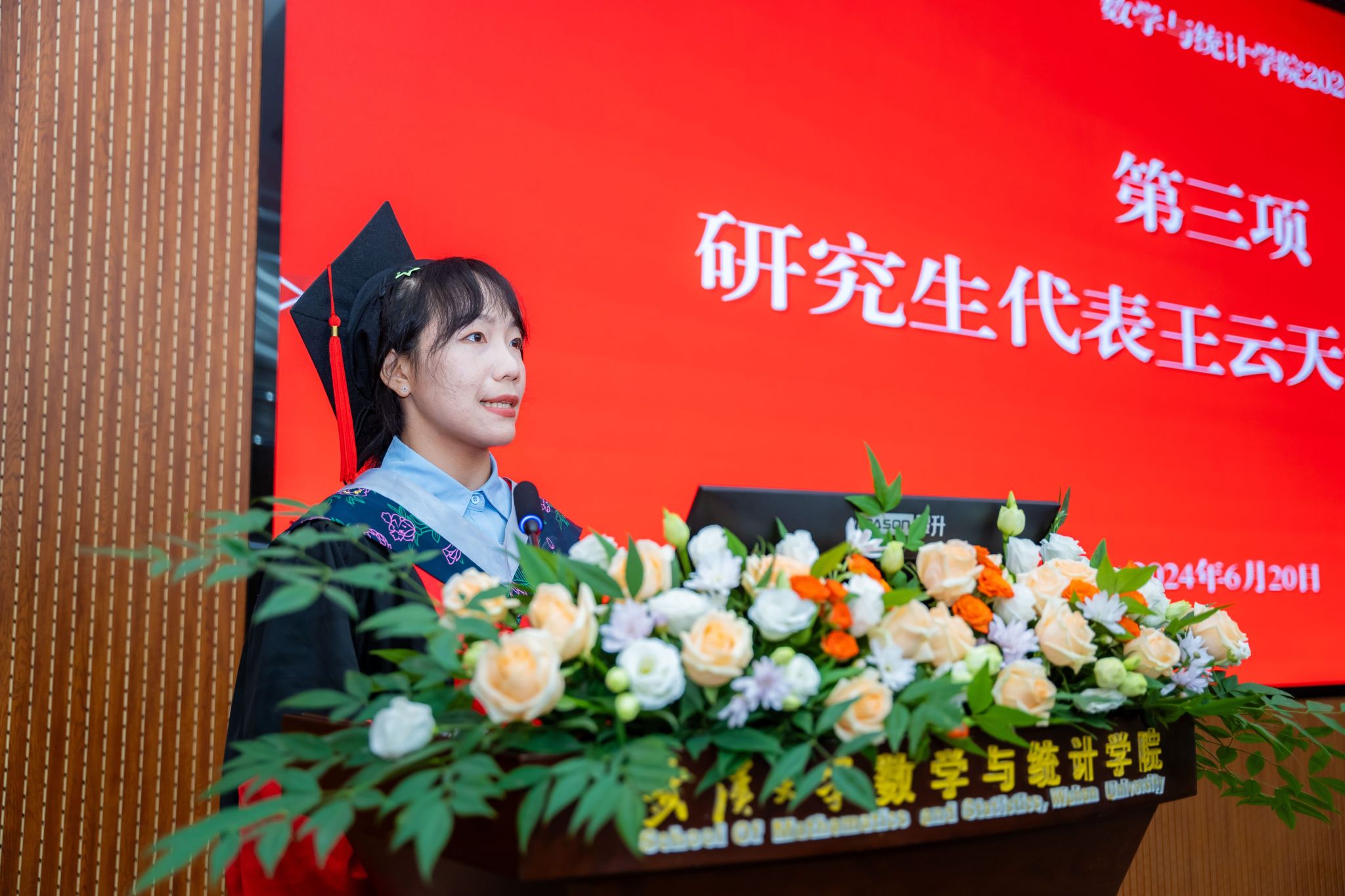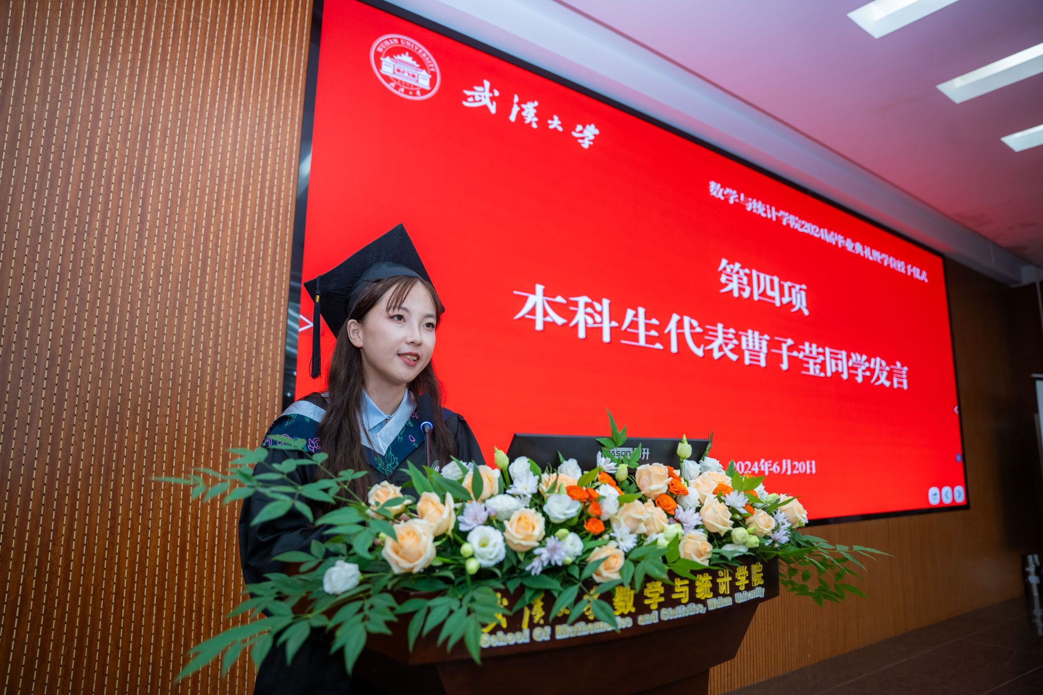 本科生代表曹子莹分享了自己的成长经历,四年数院时光教会她“千磨万击还坚劲”的精神和“厚积而薄发”的韧性。她表示,未来将潜心科研,努力为国家的医疗事业和人类的健康发展作出贡献;同时祝各位毕业生同学前程似锦,破浪前行。