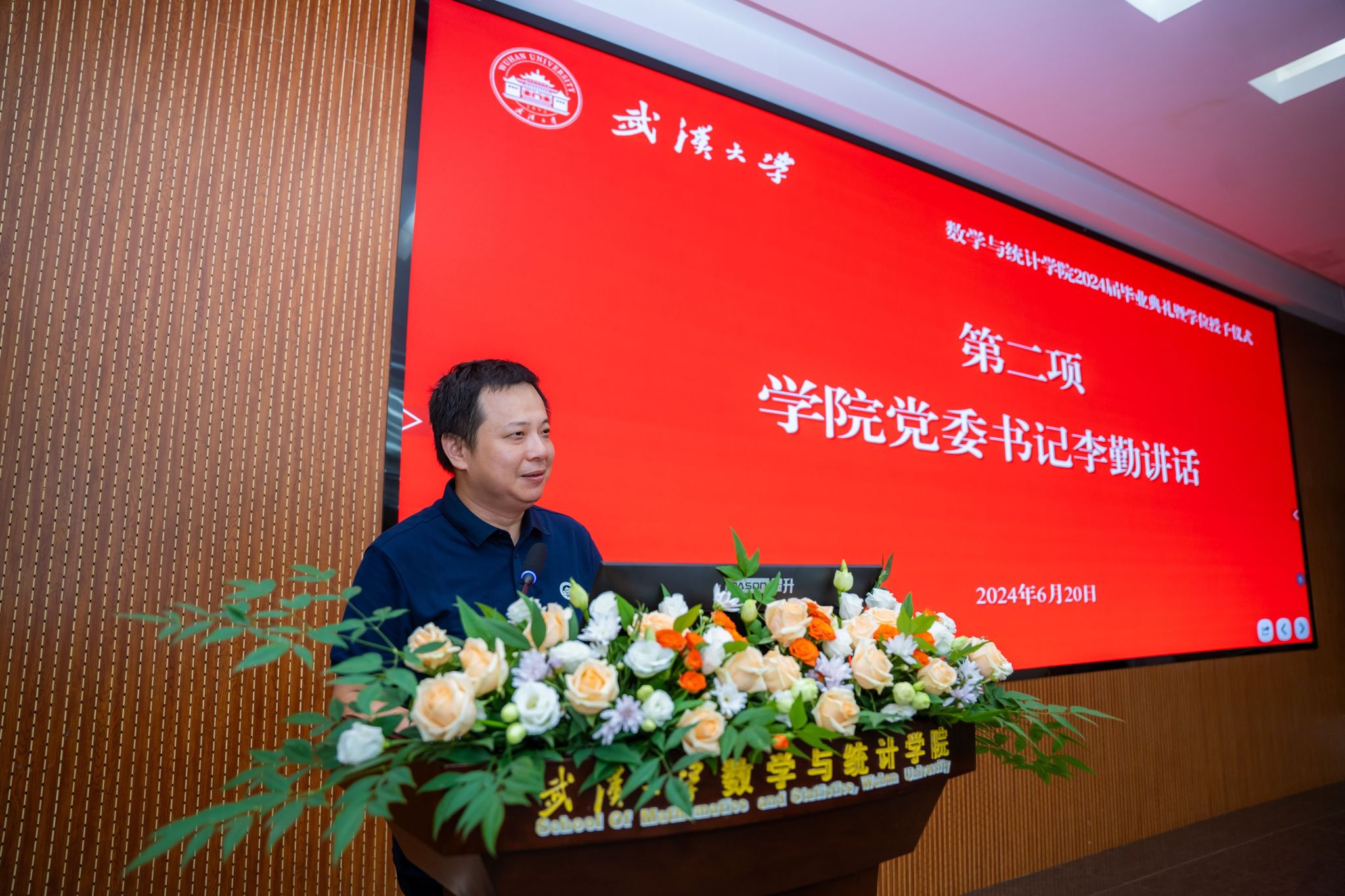 党委书记李勤代表学院致辞,他对毕业生提出了希望和要求,寄语数学学院的毕业生四个人生关键词语,分别是:坚持、严谨、热爱、青春。最后,他祝毕业生同学们一路繁花,前程似锦。
