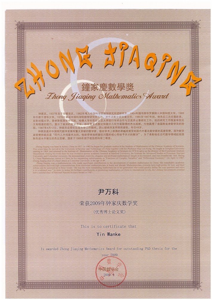 青年教师尹万科的博士论文全票通过专家评审,获得第九届钟家庆数学奖。这是继尹万科博士2007年获新世界数学奖银奖之后又一次摘得数学界大奖。