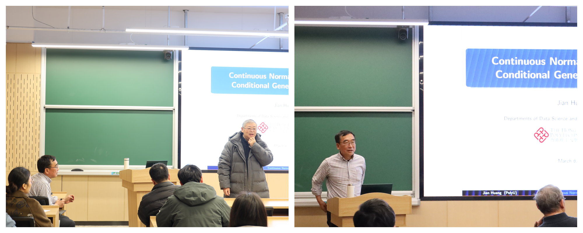研讨会结束后,黄坚教授带来了一场精彩的天元数学中部中心Colloquium报告,报告题目为“Continuous Normalizing Flow for Conditional Generative Learning”。国家天元数学中部中心学术委员会副主任陈化教授主持报告。在报告中,黄坚教授详细报告了其与合作者在统计学前沿领域所开展的工作以及取得的突出贡献。报告内容丰富、见解深刻,引起了在场听众的强烈兴趣。报告结束后,黄坚教授还与听众进行了热烈的互动交流,现场气氛十分活跃。