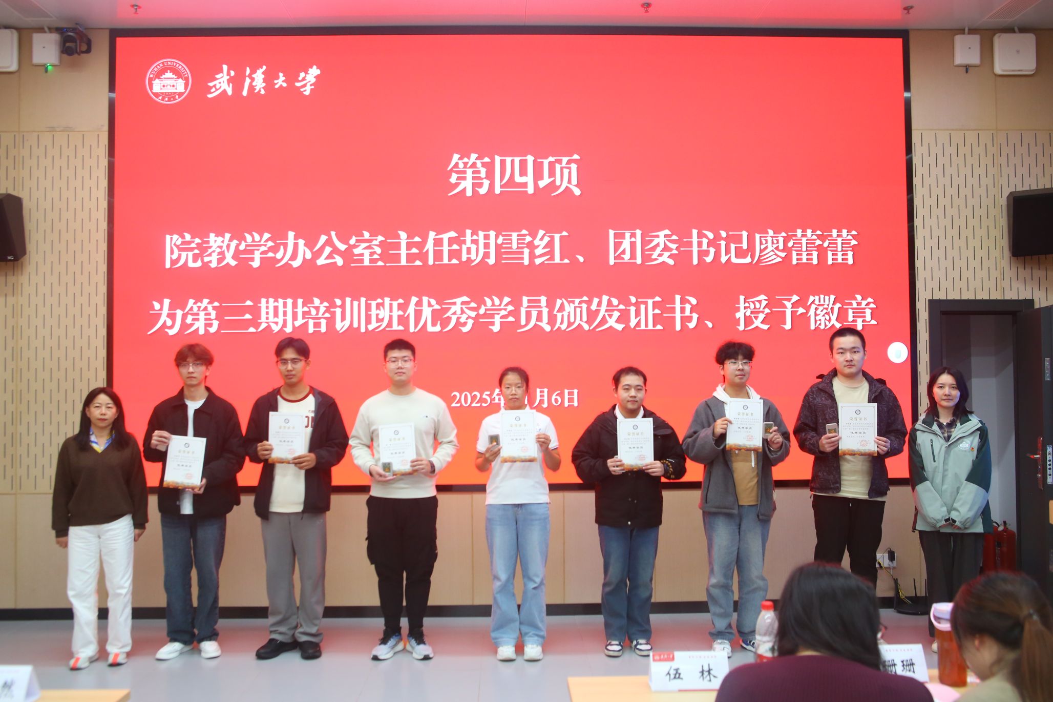 2025�11�6日晚18:30,我院“青年马克思主义者培养工程”第四期培训班暨第三期培训班结业仪式于雷军科技楼B102报告厅举行。校团委副书记伍林、院党委副书记刘珊珊、院教学办公室主任胡雪红、院团委书记廖蕾蕾、兼职辅导员袁琪和“青马工程”第三、四期培训班学员参会。学院“青马班”班主任、兼职辅导员刘傲然主持会议�