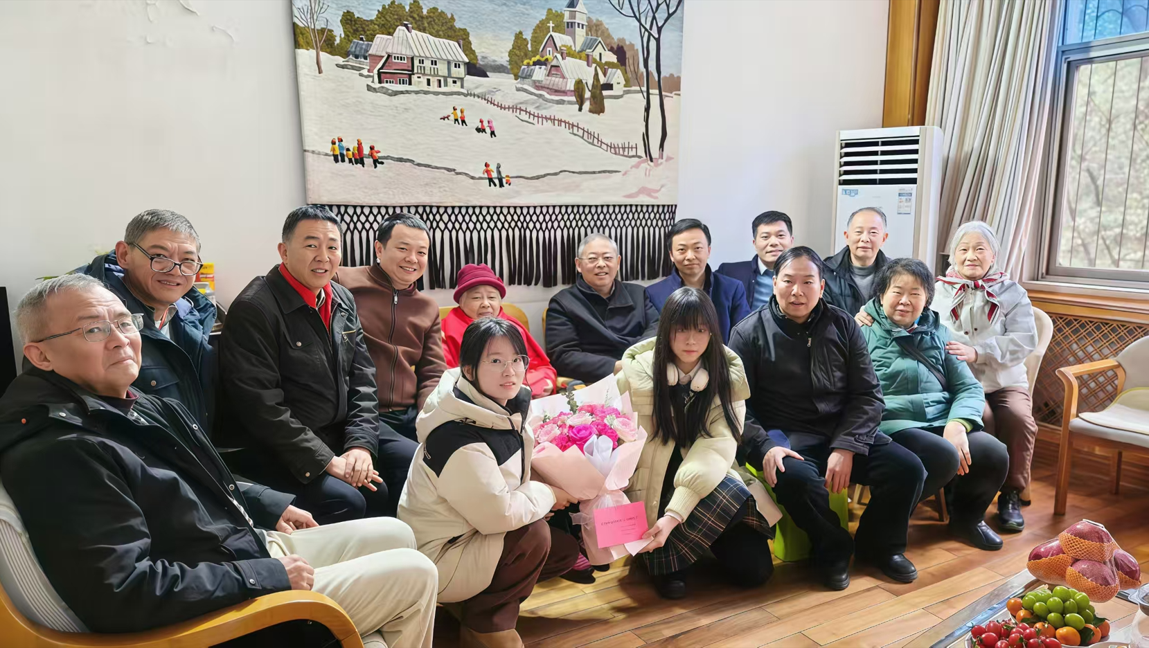 程老师看到众人前来看望,欣然拍手,笑容如孩童般灿烂。叶骏代表离退休工作处送上果篮,院党委书记李勤向程老师献上鲜花和生日蛋糕,陈化教授和刘伟安教授也向他们敬爱的老师献上真诚的祝福!程老师的三代传人共同唱响《生日快乐》歌,为她点亮百岁蜡烛,温暖的烛光映照着她幸福的笑容,现场洋溢着欢乐与感动。冬日虽寒,也吹不凉我们心头为您沸腾的喜悦;再厚的雪,也盖不住您生命里透出的百年芳华�