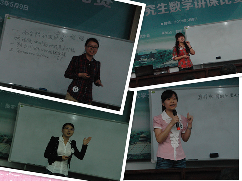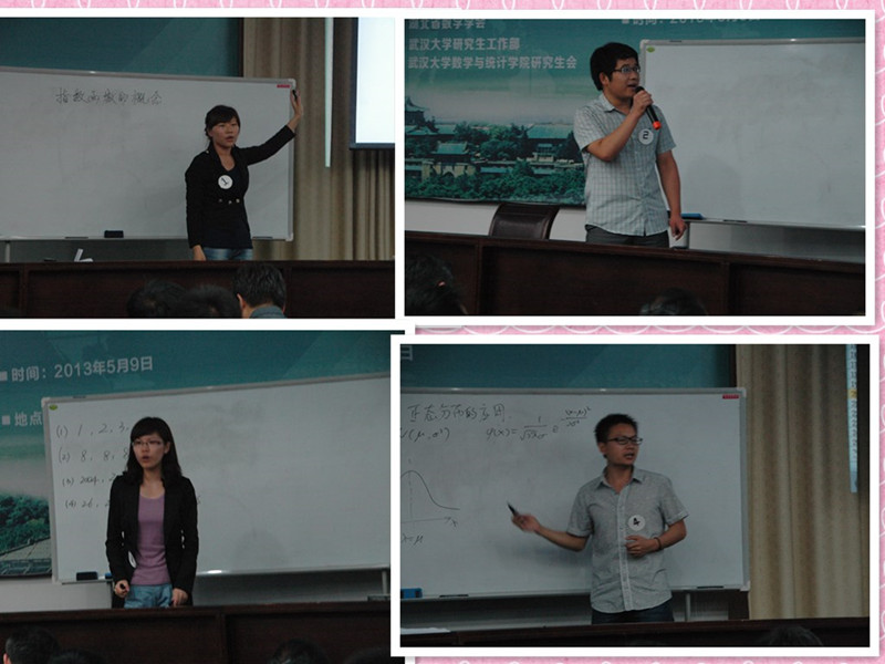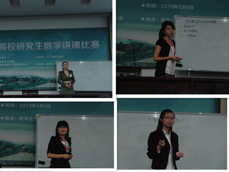 2013年5月9日晚上6:00,第八届湖北省高校研究生数学讲课比赛在数学会堂火热进行。本次比赛由湖北省数学学会、杏吧