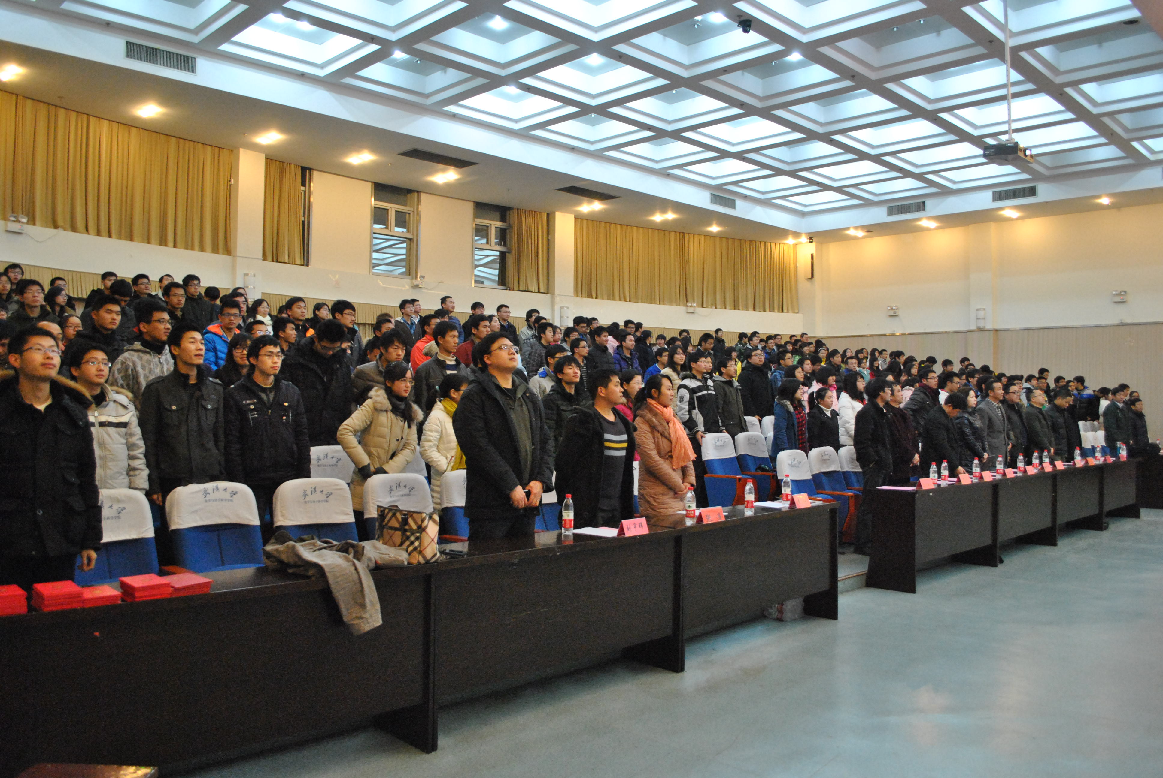 2012年学生工作总结表彰暨考风考纪动员大会于化院创隆报告厅隆重召开。校学工部副部长张文军,校研工部副部长胡静,校团委副书记文云冬,学院党委书记张明智,常务副院长赵会江,党委副书记、副院长吴蜀江,副书记上官海兰,副院长樊启斌,副院长陈文艺,副院长冯慧,副院长胡亦钧,基础数学系主任涂振汉,应用数学系主任羿旭明出席会议。学院学工办全体老师参加了会议。会议由学院党委副书记上官海兰主持。