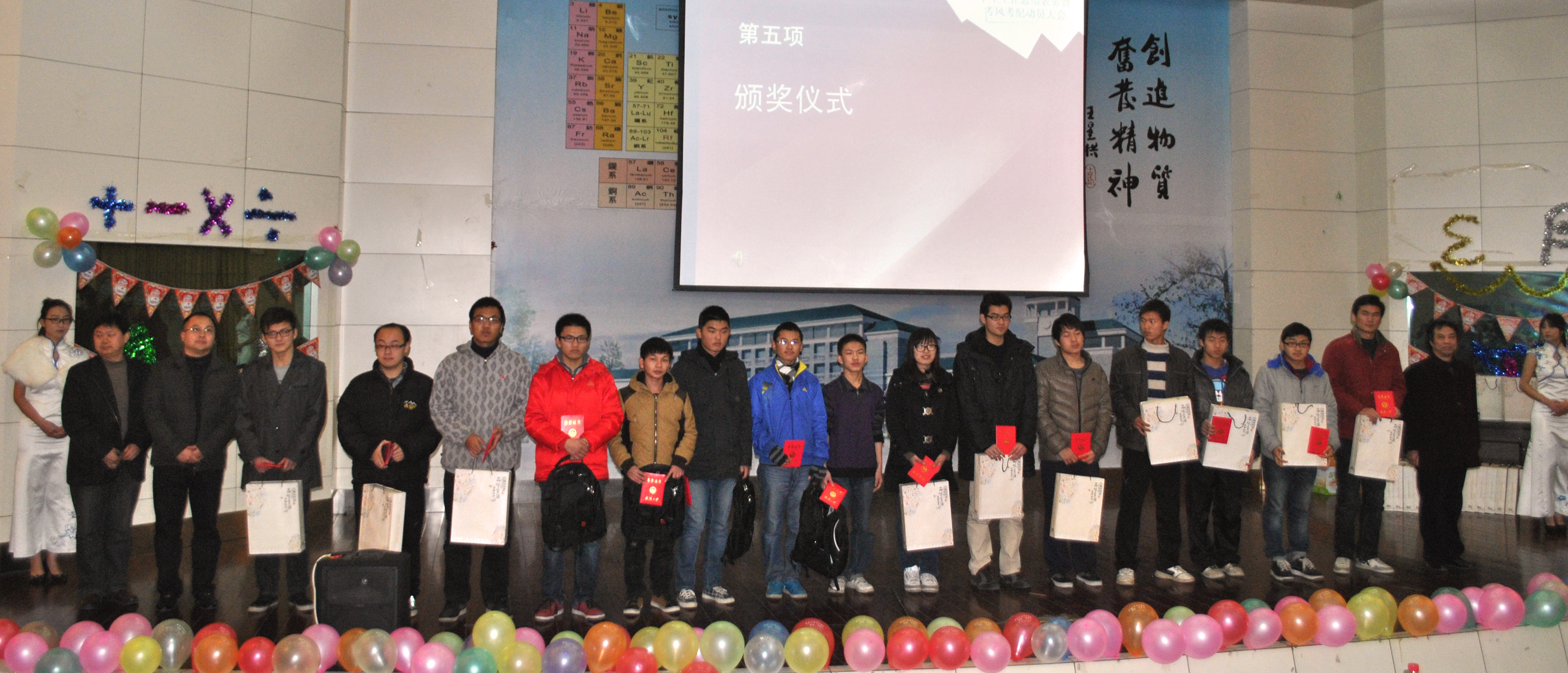 之后是学院常务副院长赵会江教授宣读表彰文件和颁奖仪式。2012年院数模竞赛先进个人、优秀学生干部、社会活动积极分子、优秀志愿者、文明卫生寝室的代表依次上台并接受领导颁发获奖证书和奖品。