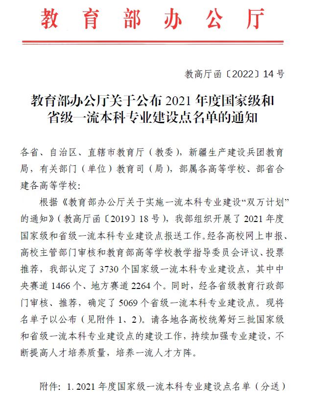 近日,教育部下发《教育部办公厅关于公布2021年度国家级和省级一流本科专业建设点名单的通知》(教高厅函〔2022〕14号),杏吧