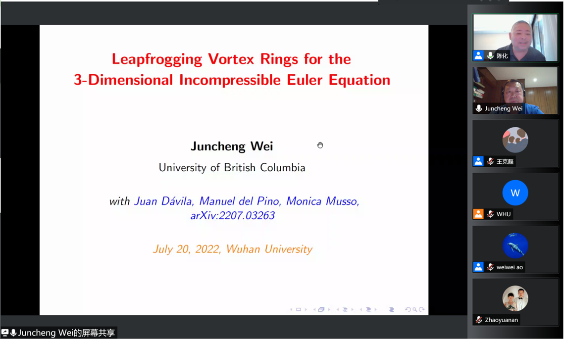 在报告中,魏军城教授首先介绍了不可压缩欧拉方程中的旋涡问题。这是流体力学理论中从十九世纪就开始研究的一个经典课题,在此方向做出重要贡献的有亥姆霍兹、林家翘等诸多著名物理学家、应用数学家,但该课题目前仍有很多有待解决的难题。魏军城教授阐述了关于漩涡的binormal flow conjecture等相关问题,介绍了近年来他及其合作者在此方向上的研究结果,包括具有螺旋线形状的漩涡、具有多个涡环的解的存在性等。然后,他介绍了亥姆霍兹当年发现的有趣现象:在适当条件下,可以存在多个涡环像蛙跳(Leapfrogging)一样跳跃前进。他介绍了和合作者在最新的一个预印本中的结果,即如何从数学角度严格构造这样具有蛙跳型涡环的解,并解释了他们为此需要发展的一些新方法,例如一种新的机制。最后,魏军城教授向与会学者及研究生提出了若干很有启发性的猜想。