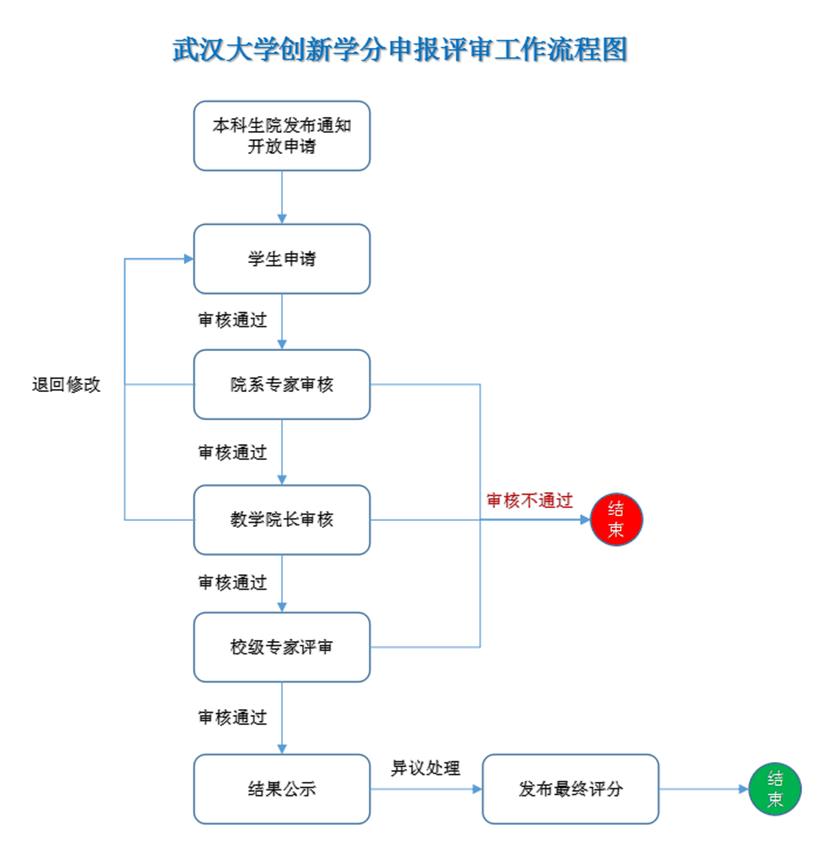 本年度创新学分申报及评审工作通过创新学分申报系统全程在线完成,工作流程如下图所示: