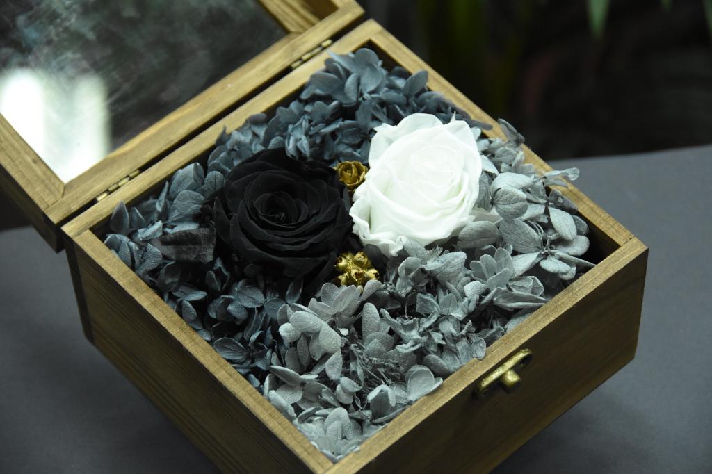 所有准备工作已经就绪,好戏正式开场!在方老师的带领之下,同学们首先将工作台上面准备好的花泥切割成合适的大小放入自己挑选的花盒之中,并用胶枪将花泥粘贴固定,至此,完美的底座便完成啦。接着,方老师示范了玫瑰花的两种制固定方法,以及如何固定花盒中的标配——绣球花。在同学们制作永生花盒的过程中,方老师一直在提供帮助,不仅随时解答他们的疑问,而且不断地提醒同学们要小心操作不要受伤。经过三个半小时的努力,每个人都制作出了自己专属的永生花盒!