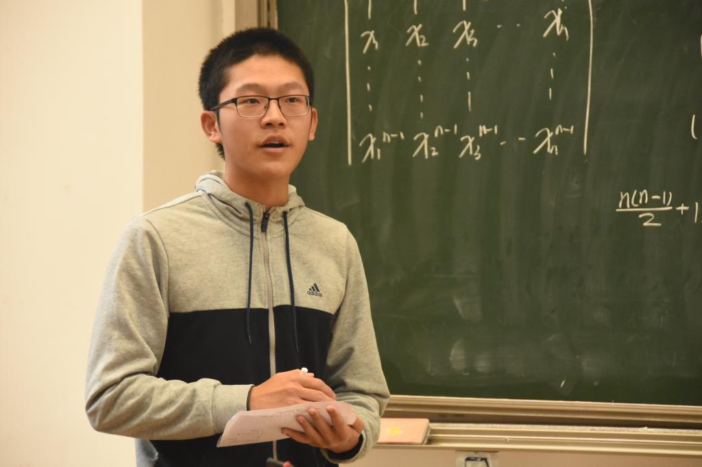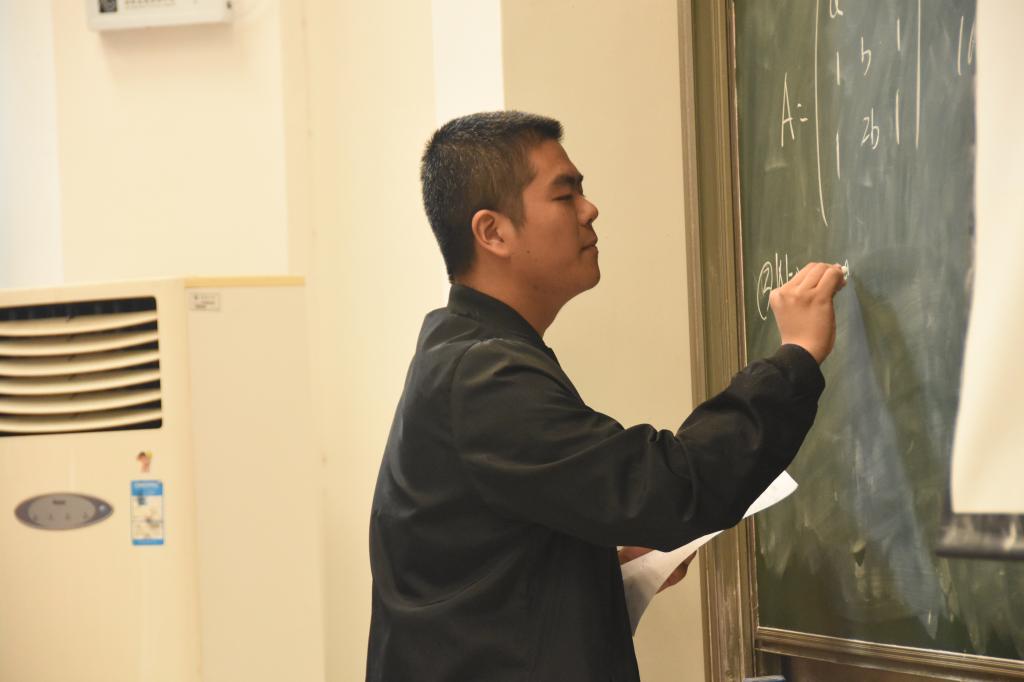 四班数分组刘润泽同学从数分课上极限的四则运算法则讲起,借课上知识进行扩展,幽默的语言不乏专业性,在带领大家探索题目的同时重温课上内容。刘同学展现的自信与灵活受到老师的称赞。高代组宣源昊同学用清晰的板书向大家展示了求解过程,在较为繁杂的讨论过程中一直保持流畅的论证,表现可圈可点。
