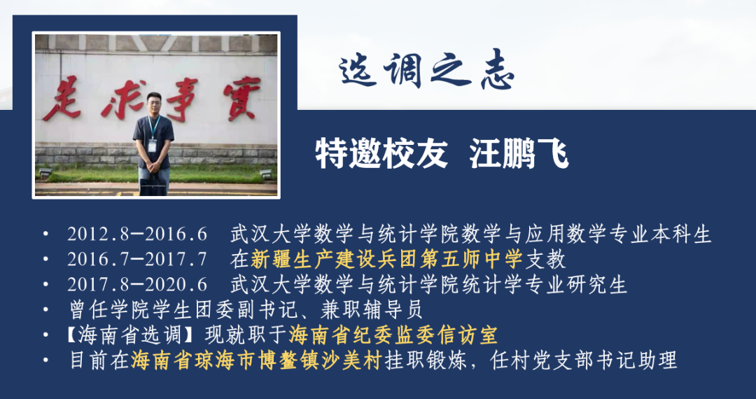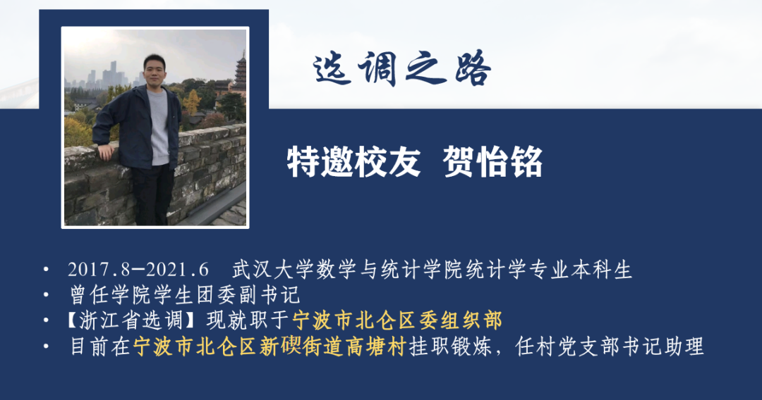贺怡铭校友心中的选调生是这样的:“选调生其实就是这样的一批人。一批有知识有能力的大学生,面对基层热土安之爱之、充满青春活力的那群年轻人,到基层去磨练,走出校门,走进基层的‘学堂’那群年轻人。”他对选调生流程、报考条件及数院学子的报考优势进行精彩剖析。