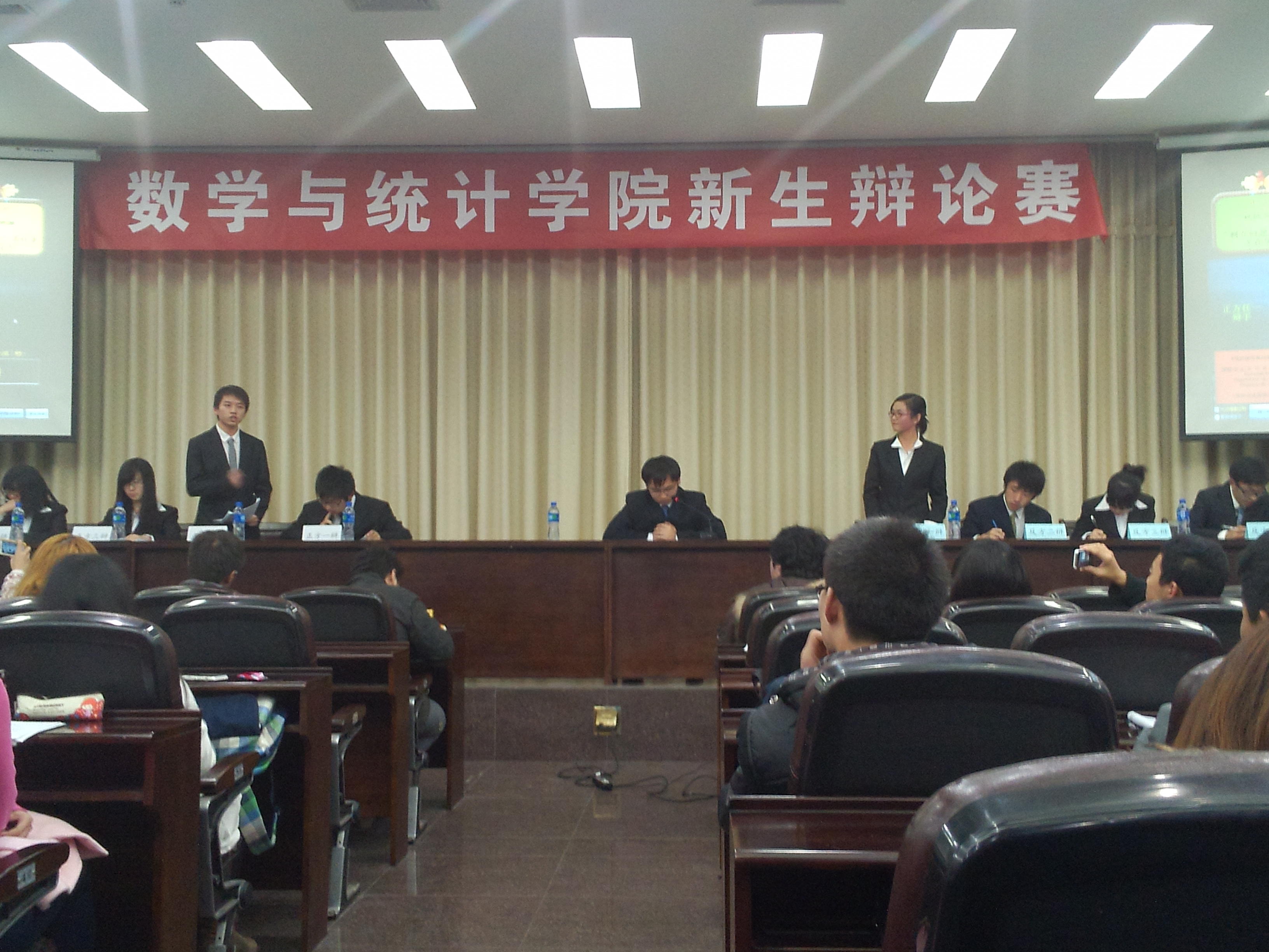 2012级新生辩论赛决赛在数学大会堂举行。经过两场唇枪舌战的精彩比赛,数学基地班的“不对也得队”勇夺桂冠,数学类二班的“V587队”夺得亚军,弘毅班和统计班组成的“毅统天下队”位夺得季军,数学基地班的马行宇同学获得“全程最佳辩手”的称号。