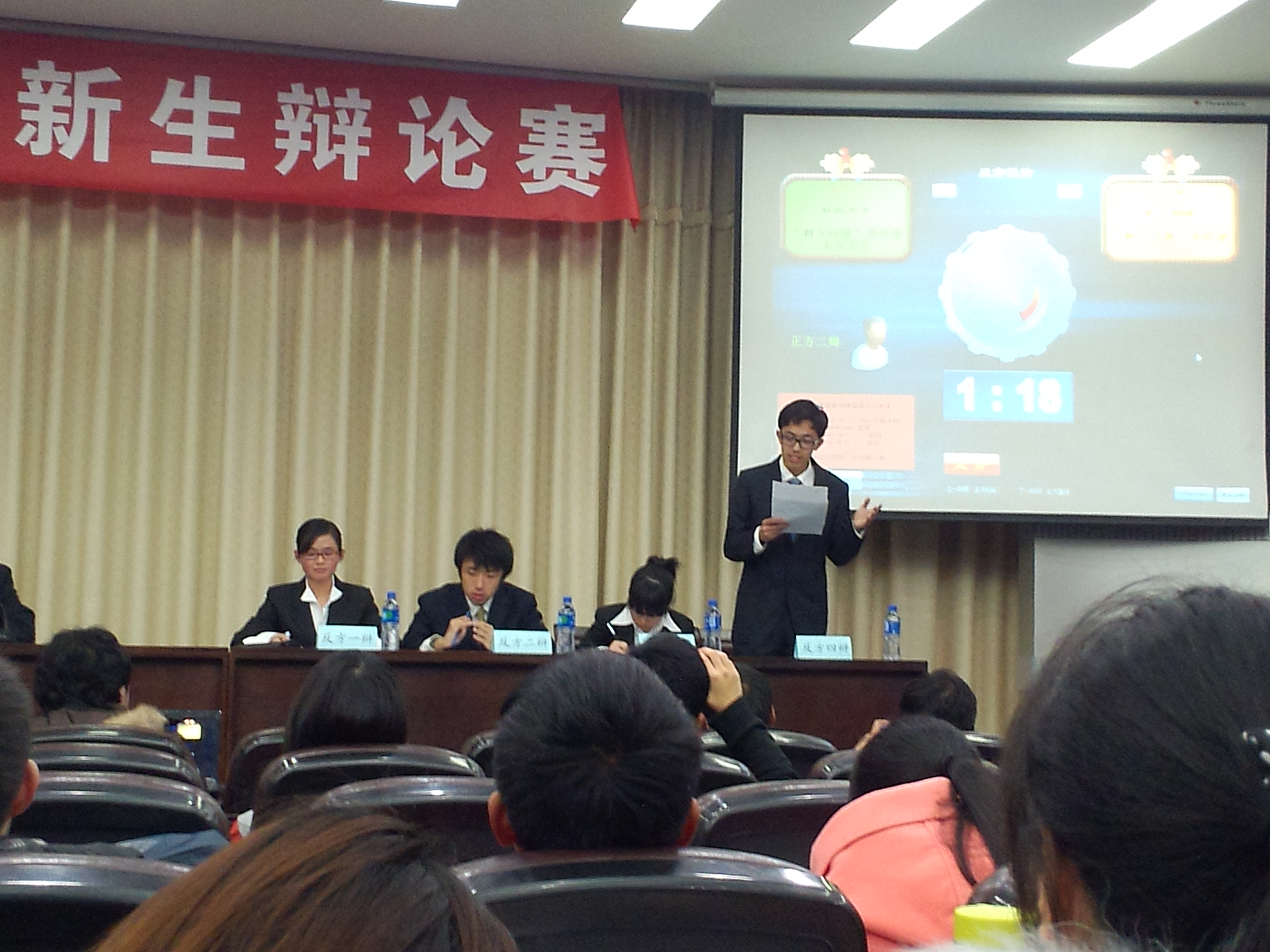 第一场是数学类一班的“霸气测漏队”与“毅统天下队”的季军争夺战,由李振坤学长主持。正方毅统天下队由一辩顾捷、二辩张煦阳、三辩梁瑛、四辩刘琪组成,他们的观点是“造成剩女问题的主要原因在男方”。反方“霸气测漏队”由一辩陈蕾、二辩王明真、三辩沈旋、四辩章傲组成,他们的观点是“造成剩女问题的主要原因在女方”。