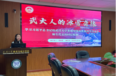 参加中国南北极科学考察队的师生代表的重要回信引入主题,带领参会党员集体学习回信内容、体悟回信精神,介绍我校南北极科学考察队日常工作规范和工作环境,讨论国际治理以及我国南极领土权益保护问题。她结合极地科考的“苦”与“乐”,从吃、穿、住、行四个方面介绍南北极科学考察队日常生活,科考队员不畏艰险、勇于开拓的伟大精神让与会同志深受触动。最后,她立足于自身专业特色,与同学们探讨了极地法律环境与极地治理研究,介绍了国际治理、南极领土权益方面的内容。她号召大家用青春之姿践行极地科考精神,在秀美珞珈读懂极地科考、读懂青年人的责任担当,为实现中华民族伟大复兴贡献更多珞珈青春力量!