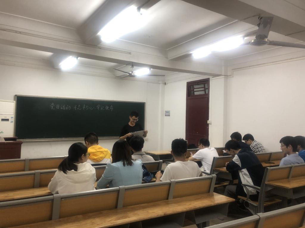 在会上,支部党委书记方圳东首先和大家一起学习习近平总书记的讲话内容,共同学习并且和支部党员们交流对"不忘初心,牢记使命"这一主题的感触。他说:"我们党从诞生之日起,一路筚路蓝缕,克服一个个艰难险阻,我们党始终坚持为人民谋幸福的主旨,和人民站在一起,得到广大群众的拥戴和爱护。我党一路上始终都把人民放在最重要的位置,依靠群众才取得了今天的骄人成绩。在过去的几十年里,在我党的领导下,中国人民不论是在经济建设还是文化建设都取得了骄人的成绩。但是无论如何我们都不要忘记了我们的出发点是为了人民谋幸福这一历史任务。现在我们虽然让全国人民达到了温饱的目标,但是还有小部分人民还没有脱贫,全民脱贫任重而道远。作为我们学生来说,我们要积极拥护党的领导方针,抓学业抓进步,以自己的切实可行的行动为以后建设社会主义中国作为好准备!"