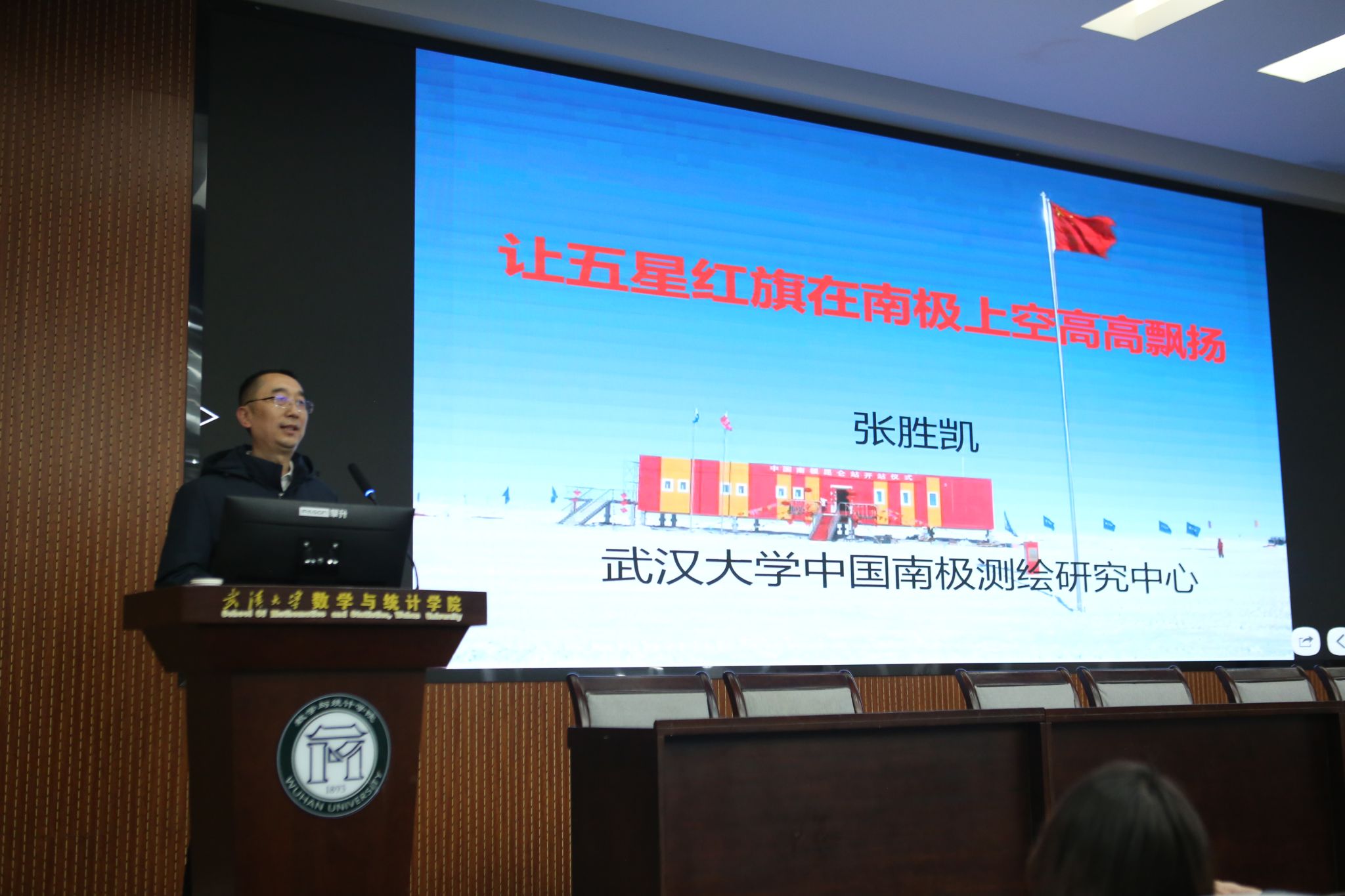 中国南极测绘研究中心副教授张胜凯应邀作专题报告。院党政班子成员、在职和离退休教工、学生代表近200人参会。院党委书记左军主持会议。