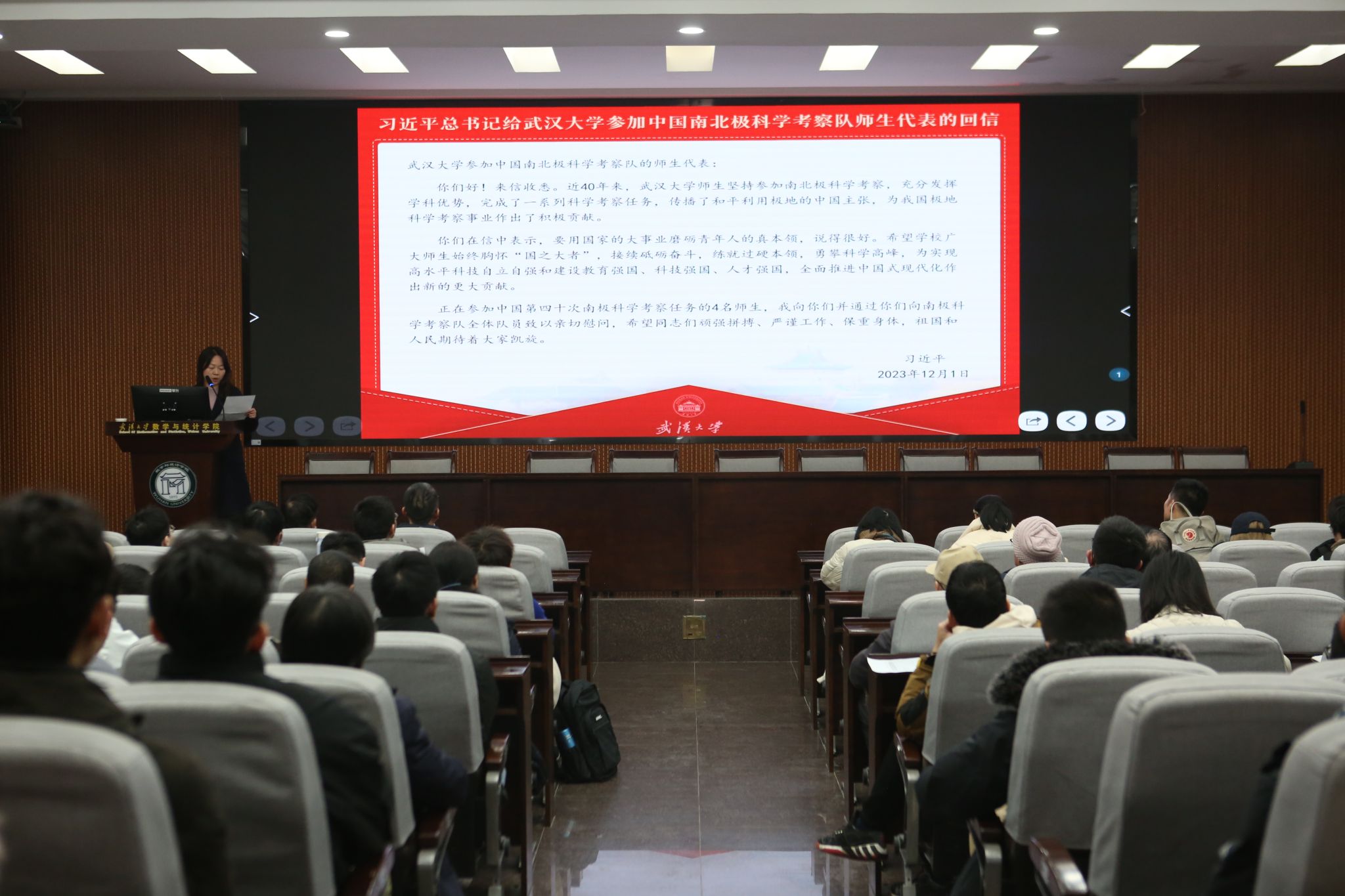 参加南北极科学考察队师生重要回信精神辅导报告会。杏吧