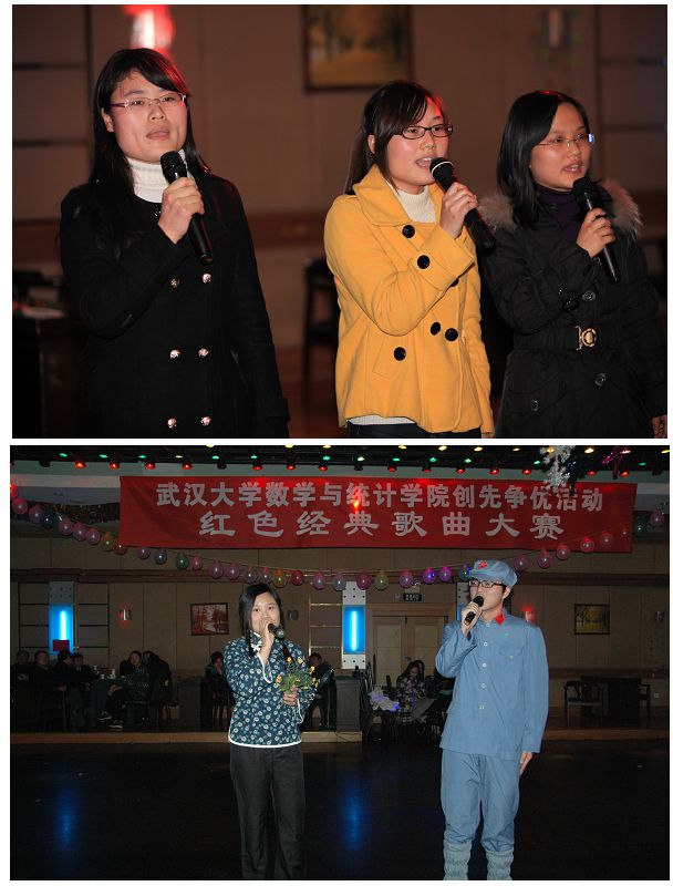 在校明珠园歌舞厅成功举行学院创先争优特色活动“红色经典歌曲大赛”,活动由院党委主办,院工会承办,湛少锋老师、刘伟安老师、胡宝清老师、胡亦钧老师、徐振华老师应邀担任评委,李好老师、赵雪荣同学、吴舒怡同学共同担任主持人。比赛在轻松欢快的气氛中进行,最后,陈化院长宣读了比赛结果:由尹常倬老师、方和平老师、黄安云老师表演的京剧《智斗》荣获特等奖;洪志明老师演唱的《母亲》、2010级硕士研究生宋平凡、杨冰演唱的《十送红军》荣获一等奖;2008、2009级本科生王秀慧、陶颖、赵烁演唱的《半个月亮爬上来》、概率与统计数学系张正良老师演唱的《天路》、张洁洁同学演唱的《我和我的祖国》荣获二等奖;应用数学系王艳老师演唱的《祖国啊我永远热爱您》、计算数学系陈国贤老师和周进老师演唱的《军港之夜》、基础数学系小合唱《大海啊故乡》、肖玉霞老师演唱的《映山红》、2010级硕士研究钱礼演唱的《歌唱祖国》、2010级硕士研究生张媛媛、何逊眉、汪琴、贾苹苹演唱的《喀秋莎》荣获三等奖。其中,2009级本科生范仲鸣还为大家带来了一曲电子琴独奏《绿袖子》、卢晓玲老师表演了独舞《在希望的田野上》、陈化院长表演了独唱《洪湖水浪打浪》、尹常倬书记演唱了《草原上升起不落的太阳》,更为比赛带来了一次又一次高潮,最后,比赛在热烈的掌声中圆满结束。(摄影:洪志明 王忠海)