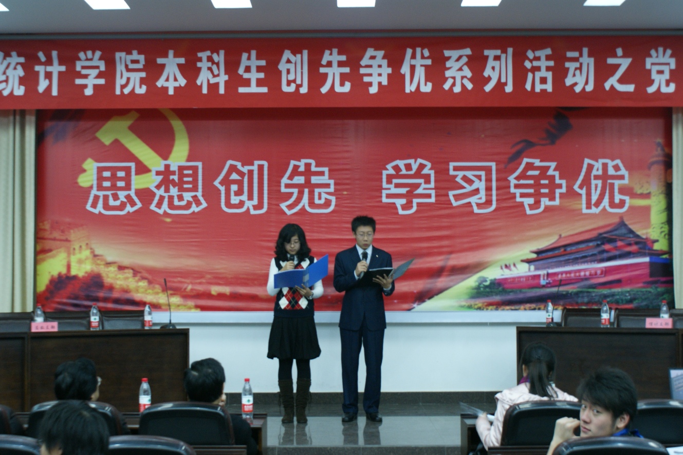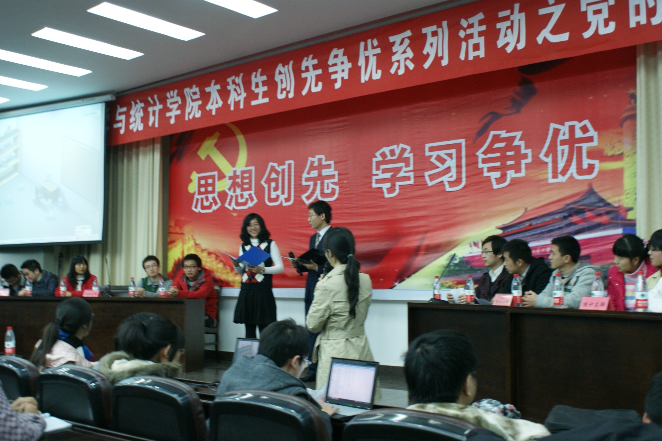 11月23日晚,一场以“思想创先、学习争优”为主题的党的知识竞赛活动在数学会堂隆重举行。出席本次知识竞赛的院领导有院党委书记尹常倬、院党委副书记吴蜀江、院学工办主任黄安云、院团委书记李好以及辅导员胡法拉等。全院本科生党员和入党积极分子参加了大会,大家为本次活动做了充足的准备。