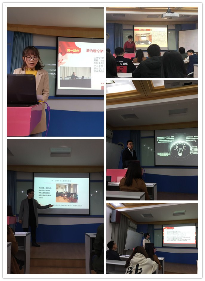 述职开始前,各支部党支书和学生党员评委代表分别就座。随后,由主持人作简单开场,支书依次上台介绍支部建设情况,展示环节以PPT的形式进行,各支部书记就支部建设、党建活动、经验以及不足等方面作出总结。各位党支书提起本支部在过去一年的工作如数家珍,各色活动精彩纷呈。其中尤以2017级基础数学硕士研究生党支部书记汪鹏飞的述职令人印象深刻,不仅PPT富有创意,支部活动也是极富特色,有力增强了党组织的凝聚力,并且充分发挥了普通党员在党建工作中的战斗堡垒作用。另有2016级概率论与数理统计硕士研究生党支部所开展的“天使在身边”活动,赠人玫瑰,手有余香,时刻提醒党员同志不忘入党初心,从身边做起,做党和群众联系的桥梁和纽带,深入树立为群众服务的思想。诚然还有“红色细胞”党建活动,红色观影,十九大理论知识竞赛等等活动,精彩纷呈。