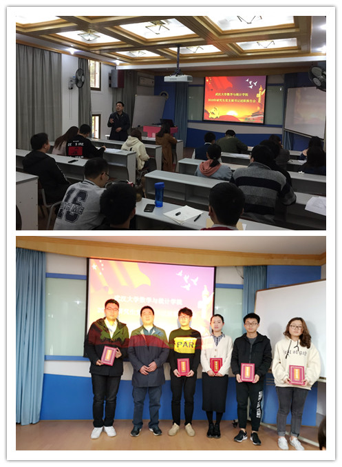 最后,恭贺2017级基础数学硕士研究生党支部书记汪鹏飞,2018级基础数学党支部书记彭德科,2017级概率论与数理统计硕士研究生党支部书记柯锦华,2017级应用数学硕士研究生党支部书记石礼零,2016级概率论与数理统计硕士研究生党支部书记章维荣获“优秀党支部书记”称号。黄书记给获奖的五名研究生党支部书记颁奖,合影留念,本次述职会议至此圆满落下帷幕。(通讯/摄影:柯锦华)