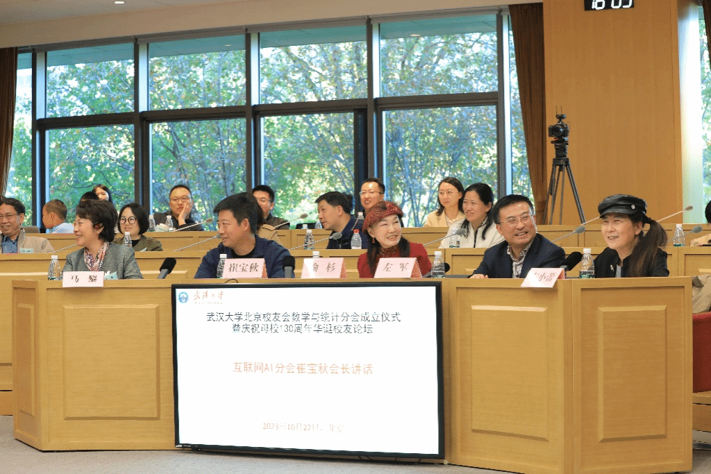 10�22日下午,武汉大学北京校友会数学与统计分会成立仪式暨庆祝母�130周年华诞校友论坛在北京隆重举行。北京校友会执行会长喻杉、互联网与AI分会会长崔宝秋、法学分会会长郭卫东、武汉大学数学与统计学院党委书记左军、在京各界校友代表出席。老中青珞珈人80余位欢聚一堂,共同见证历史性喜庆时刻,祝福礼赞百卅母校和数学学科创�130周年华诞�