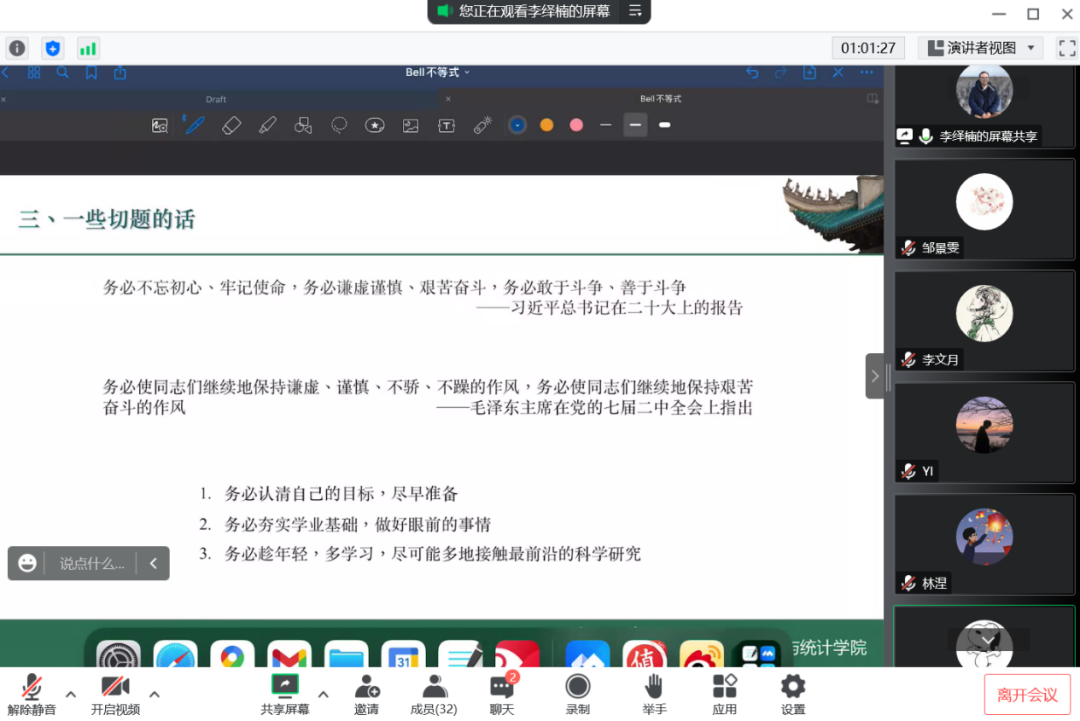 虽然今天的课程由于疫情原因延后且被迫线上展开,同学们依然怀着满腔热情,积极向老师提出自己的疑问,同时李绎楠老师的殷切期待也点燃了同学们心中之火。